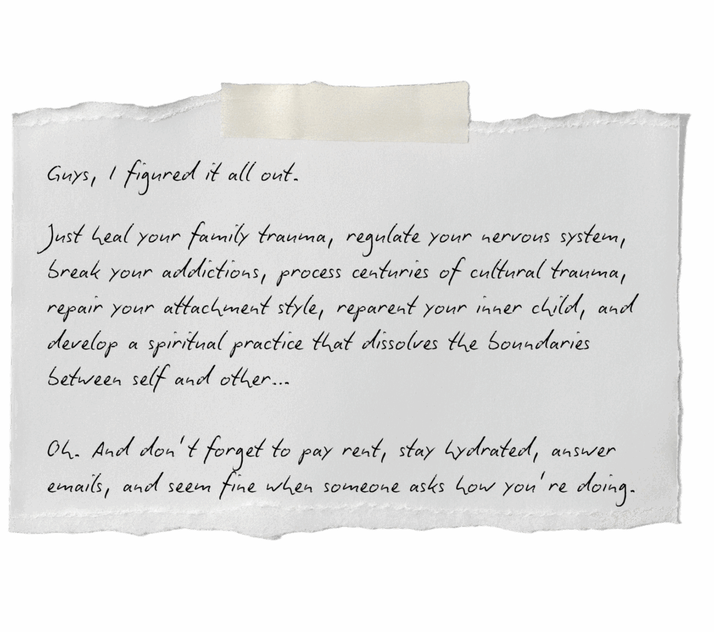 I’m not interested in performative vulnerability, macho posturing, or spiritual bypassing.